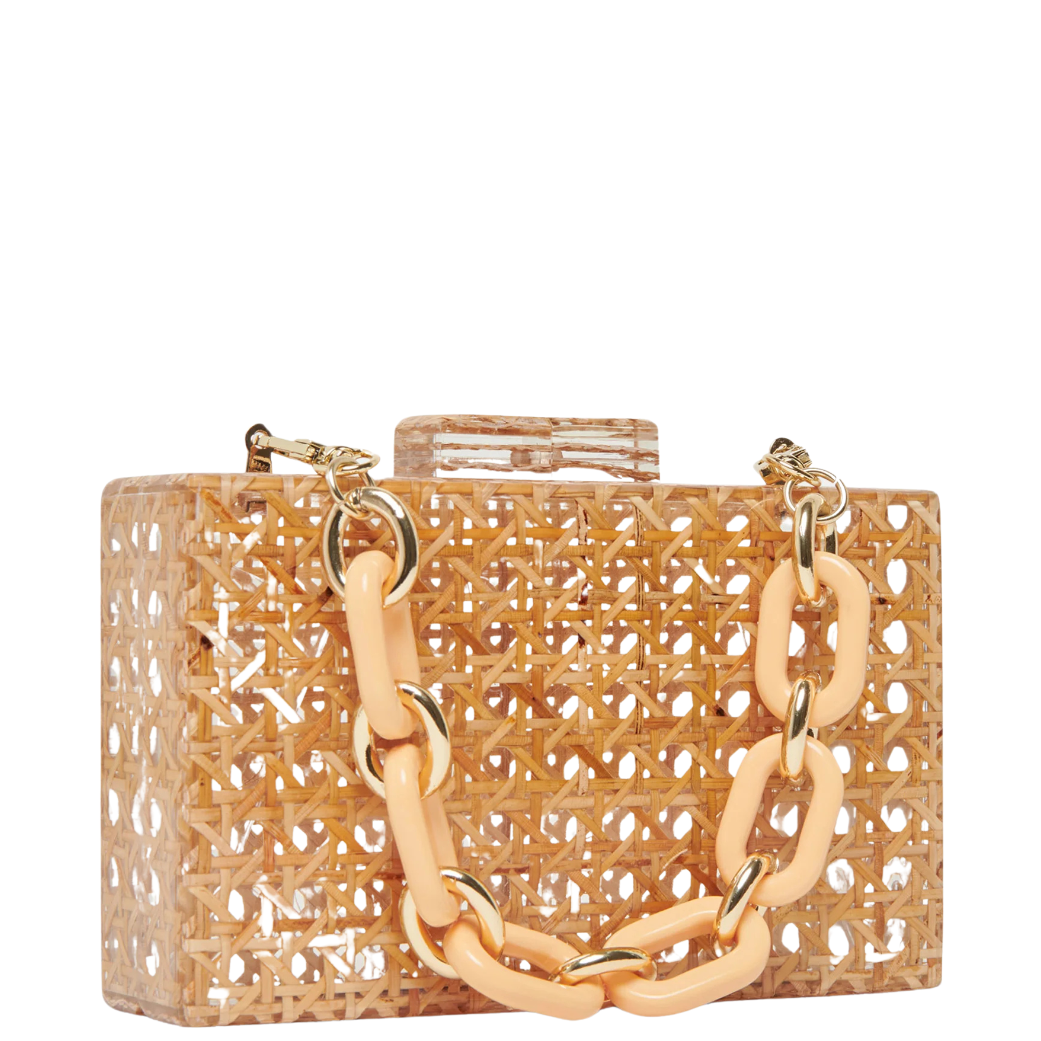 Get ready to turn heads with the Cane Clutch Natural Multi! With its unique woven acrylic design and versatile chain link handle, this IT bag is perfect for any spring or summer occasion. Plus, it comes with a removable crossbody strap for even more styling options. Don't miss out on this must-have accessory!