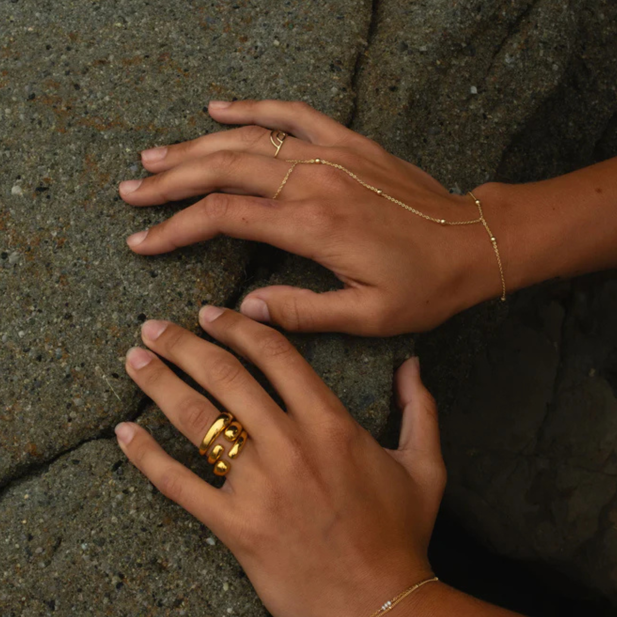 Add a touch of handcrafted charm with the Cora Hand Chain. Gold-plated and made by hand in Southern California, this adjustable chain is the perfect accessory. Spice up any outfit with this unique and versatile piece.