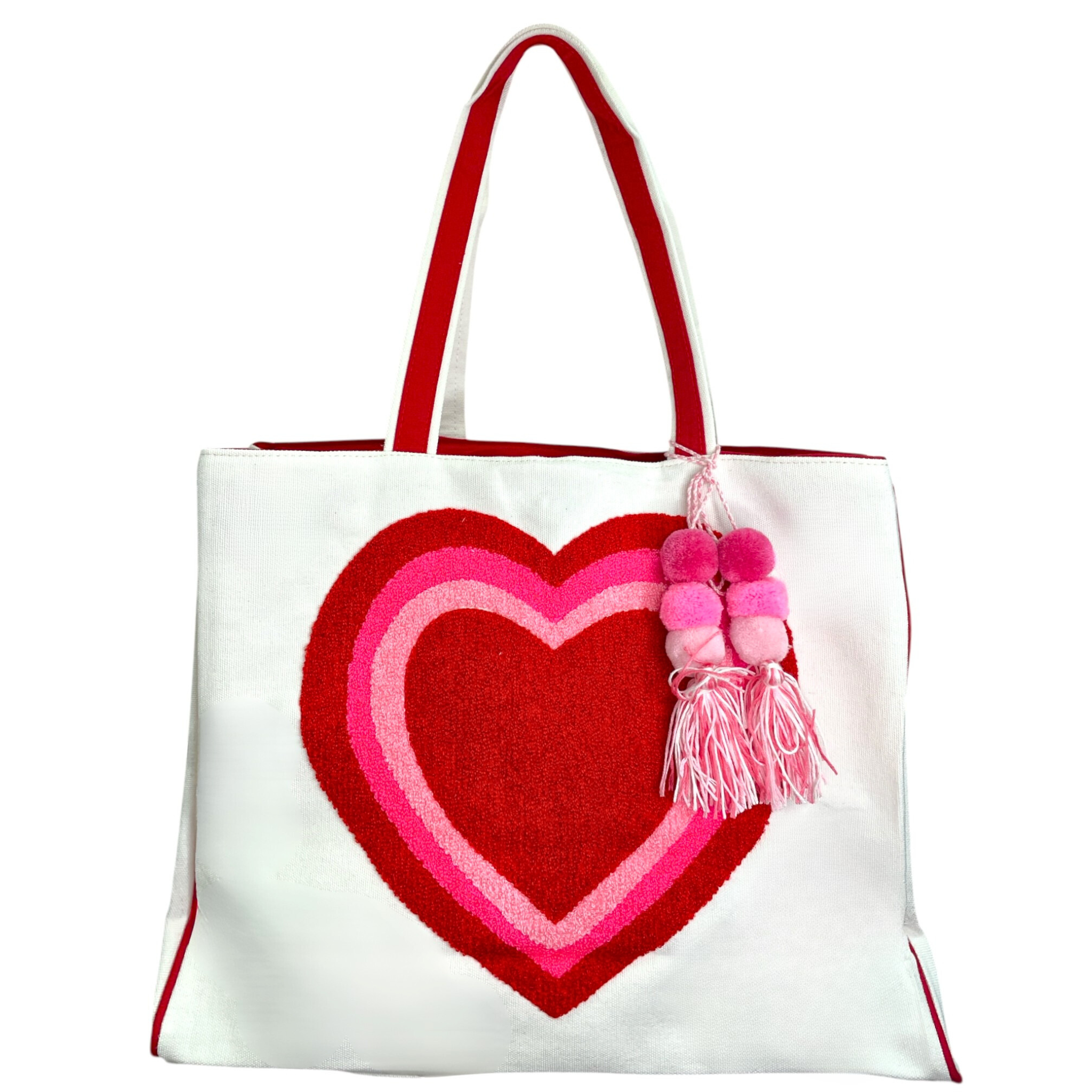Carry your beach essentials in style with our Heart Beach Bag! This canvas bag features a playful pink and red heart embroidery, accented with eye-catching pink pom poms. Perfect for a day at the beach or pool, add a pop of color and fun to your summer with this unique bag.