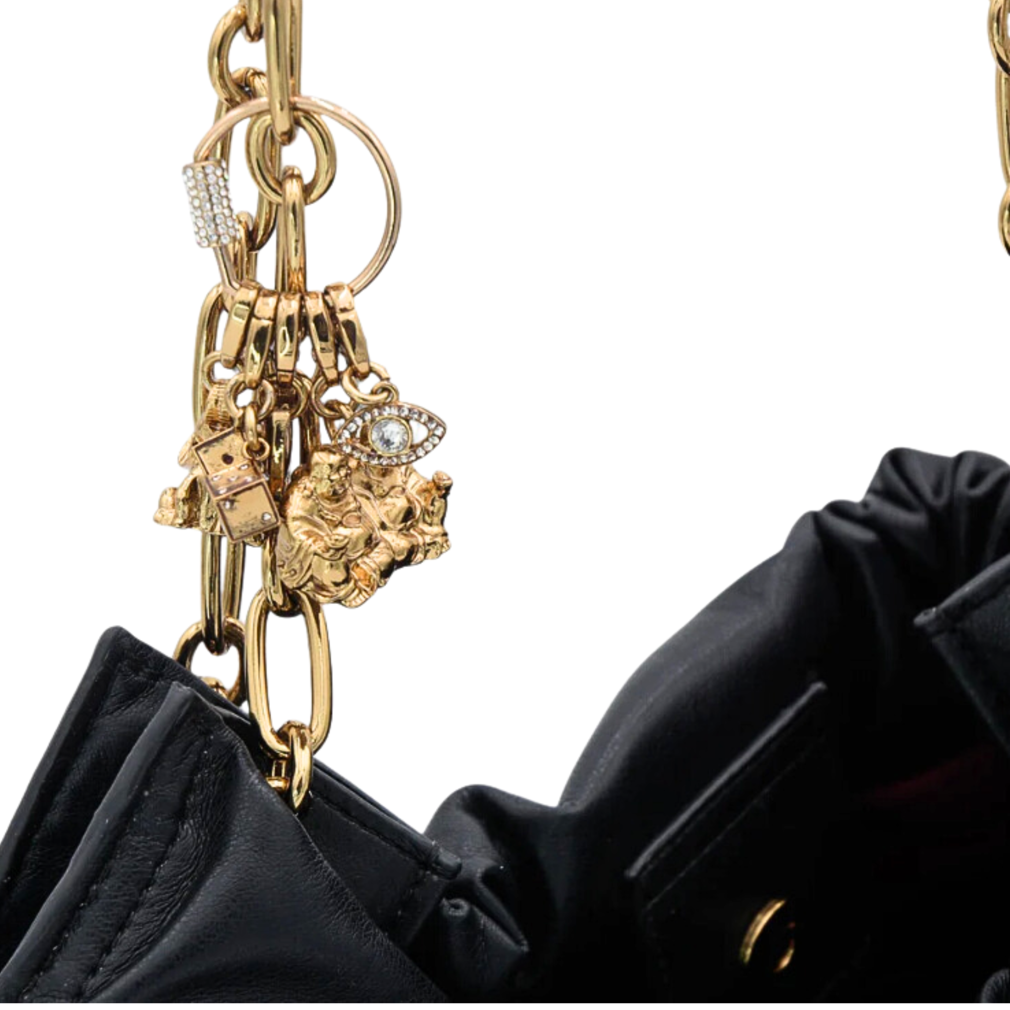Get lucky and stylish with our Lucky Super Soft Chain Tote! Made from durable nylon, this carryall features interchangeable lucky charms like a Lucky Elephant and Double Buddha. Add or remove charms for a personalized touch. Comes with standard 5 charms.