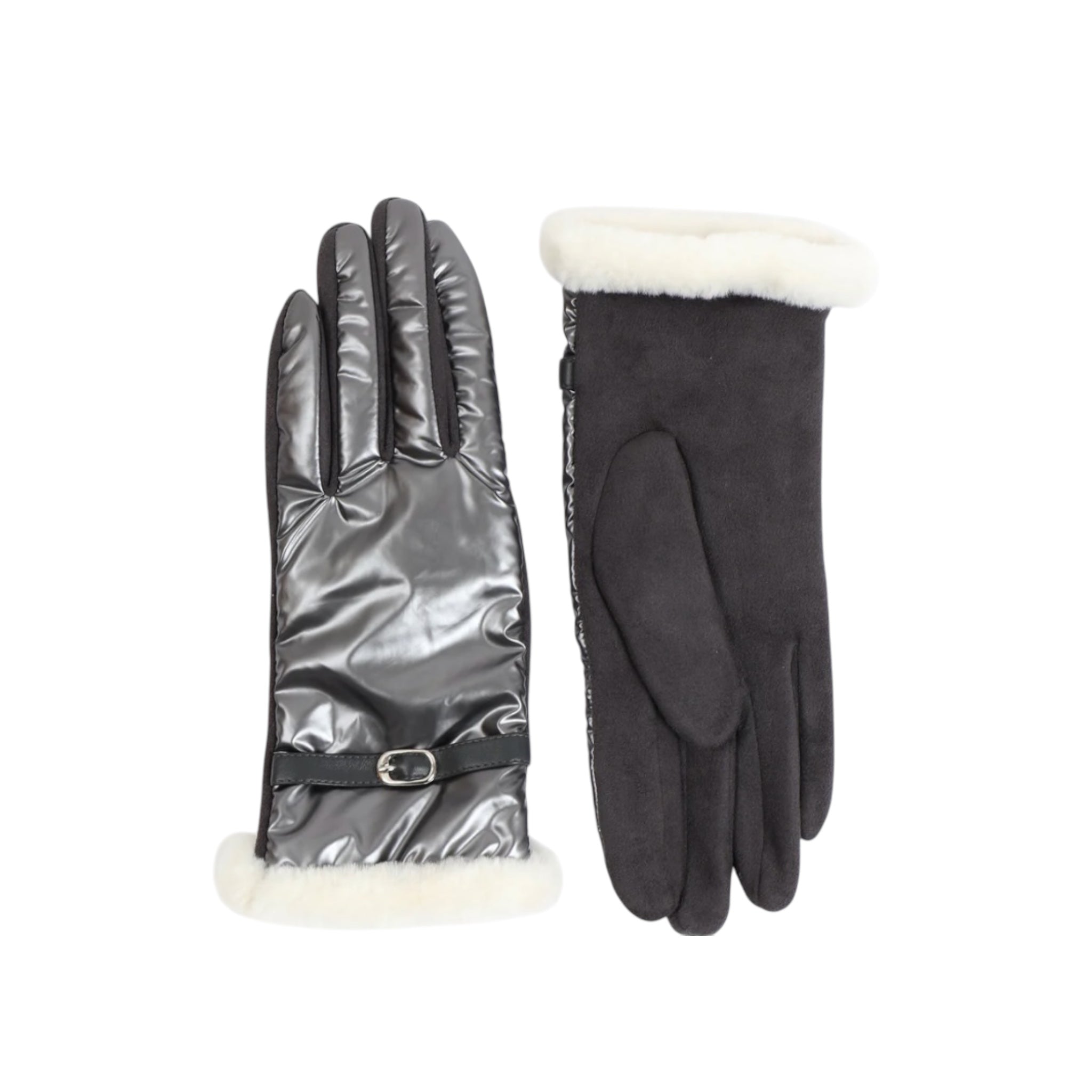 The Tara Metallic Gloves are a fabulous alternative to a traditional woolly glove that makes a real style statement. These black metallic rain gloves offer protection from damp weather and feature a warm lining. A rich and reflective patent sheen is eye-catching and sure to become a seasonal favourite whatever the weather! The eco-friendly faux sheepskin fur trim looks rich and inviting for cold hands. A smart faux leather belt embellishment adorns the wrist and features a tone-on-tone silver buckle. The palm side of these gloves are in rich black also and ensure that these little beauties can go anywhere.