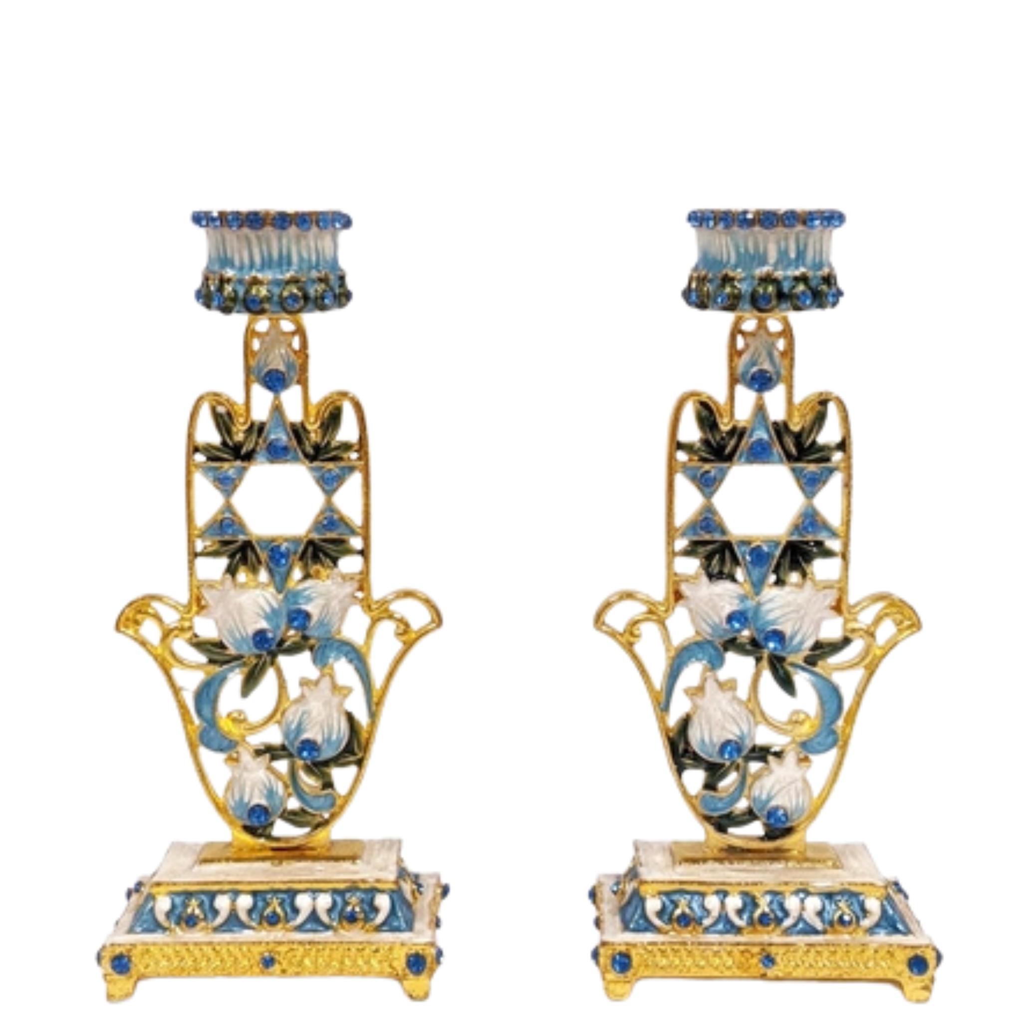 Shabbat Pair of 2 Blue Floral Hamsa Hand Candle Holder