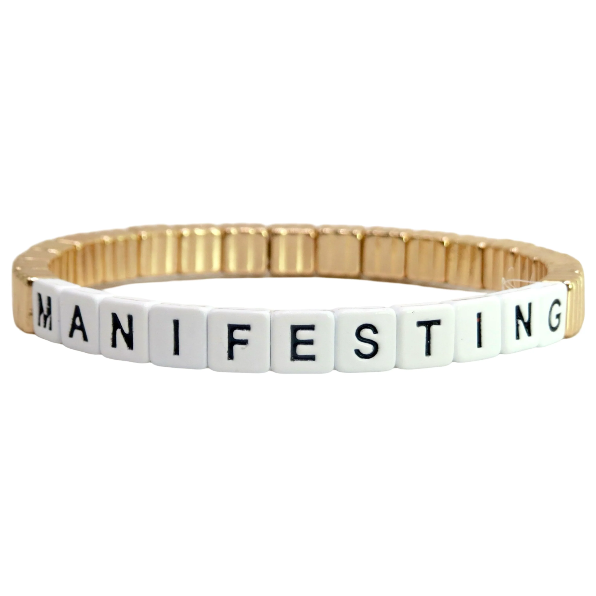 Our Manifesting Thin Line Bracelet features textured beads in a thinner size with the word "MANIFESTING." Coming in both gold and silver and part of our stackable words collection, each bracelet is 7" in length, 7MM bead diameter and is a slip-on-style. All of our single bracelets are designed to be stacked or they can be styled to wear alone.