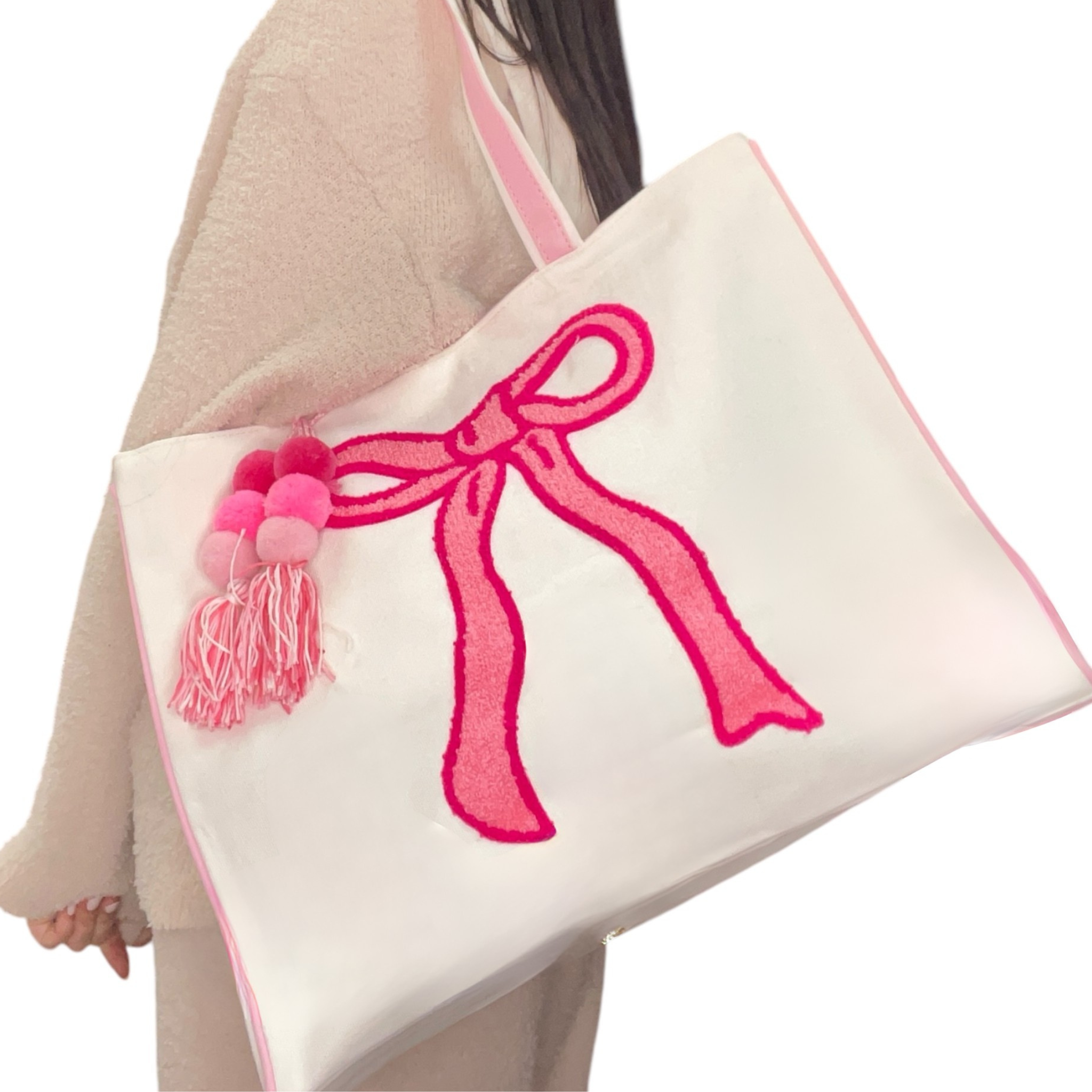 Carry your beach essentials in style with our Bow Beach Bag! Featuring a playful pink embroidered bow on a canvas background with pom pom accents and pink trim. Perfect for adding a touch of cuteness to your beach day. (Note: Not responsible for excessive compliments and envious stares.)