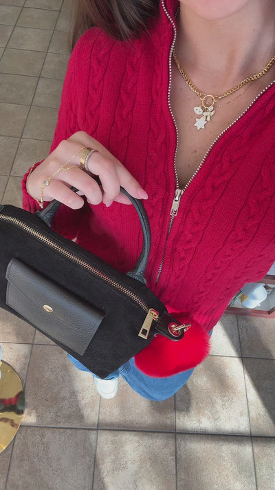 Meet your new everyday essential: the mini suede crossbody bag contrasting pebbled leather front pocket, this compact bag adds texture and depth while keeping your essentials beautifully organized.