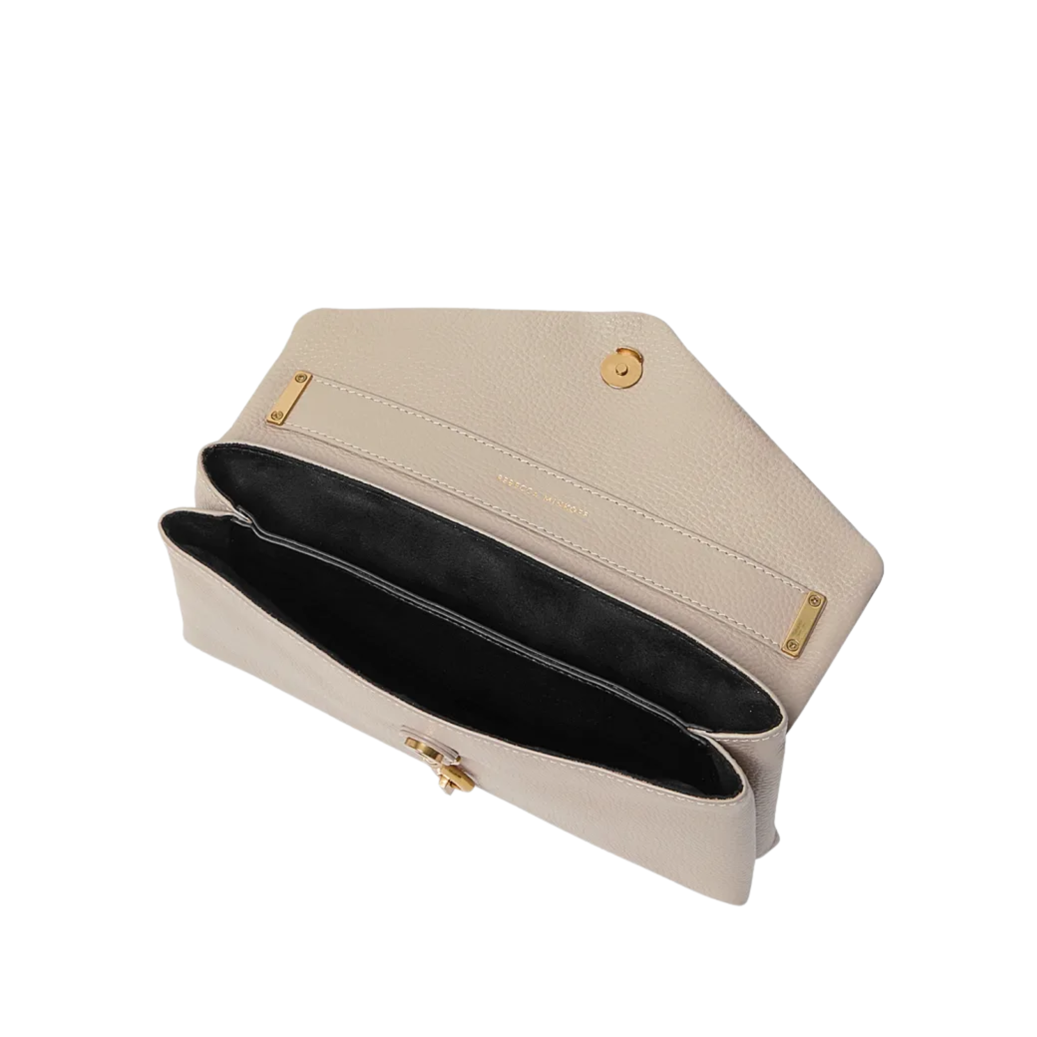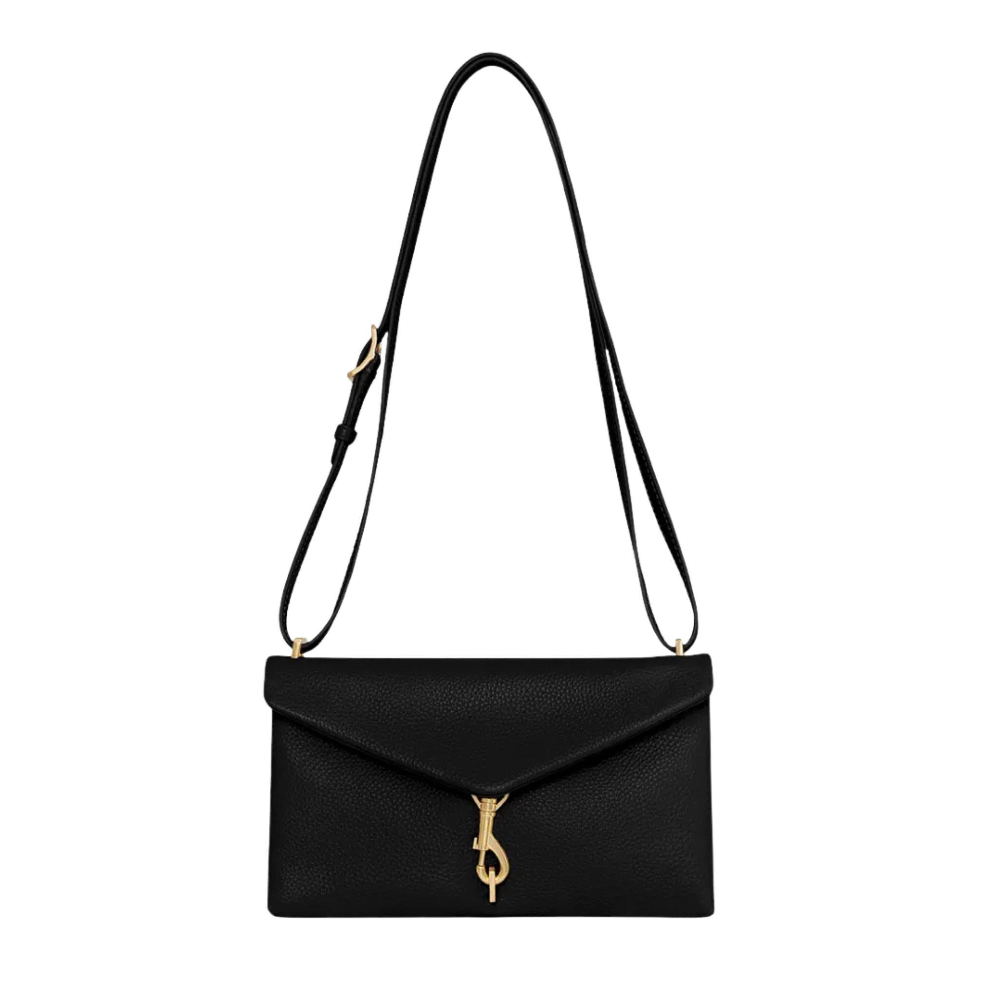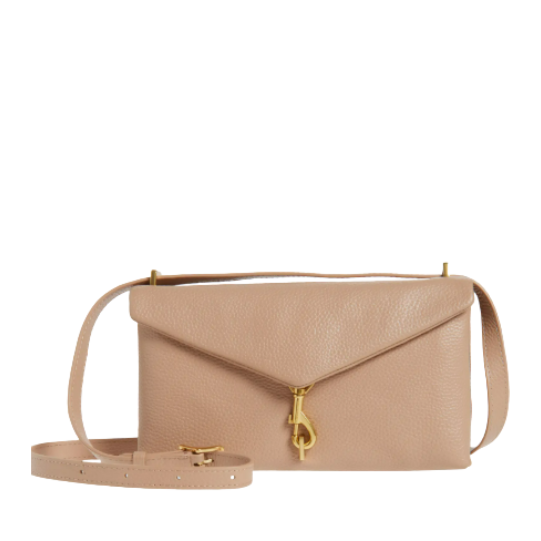 Polished clip-lock hardware—a signature of the Megan line—adds a golden flash to this textured leather crossbody fitted with a pull-through strap that adjusts for the perfect length.