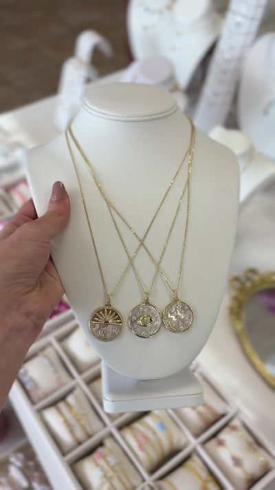 We love the dreamy look of this intricately designed mother of pearl pendant necklace. Adding a pavé moon and stars helps to make your dreams even sweeter. It’s the perfect style to layer with your other favorite MM pieces.